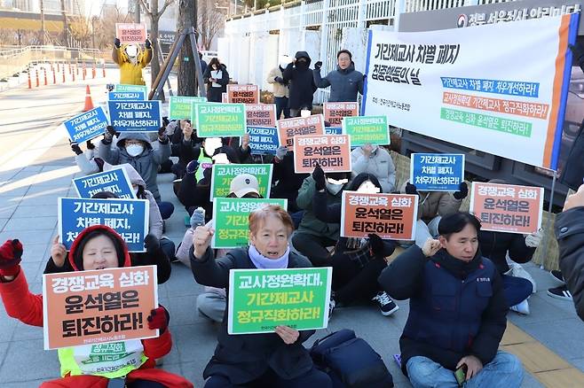 | ▲ 25년 1월 15일에 개최한 기간제교사 차별 폐지 집중행동의 날 기간제교사 차별 폐지 집중행동의 날에 참여자들이 구호를 외치고 있음. |