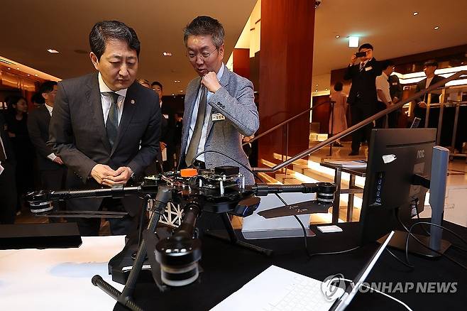 (서울=연합뉴스) 김성민 기자 = 안덕근 산업통상자원부 장관(왼쪽)이 20일 서울 중구 웨스틴조선호텔에서 열린 'K-온디바이스 AI반도체 협력포럼'에서 AI 온보드 탑재 객체 인식 추적 드론을 둘러보고 있다. 2025.5.20