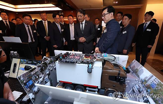(서울=연합뉴스) 김성민 기자 = 안덕근 산업통상자원부 장관이 20일 서울 중구 웨스틴조선호텔에서 열린 'K-온디바이스 AI반도체 협력포럼'에서 차량용 AI 반도체 설명을 듣고 있다. 2025.5.20