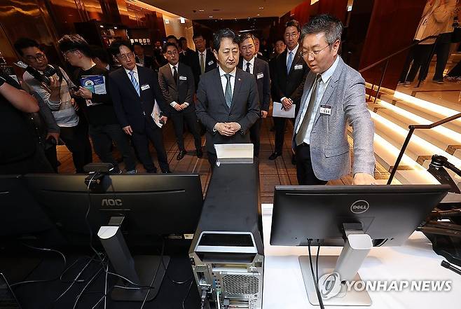 (서울=연합뉴스) 김성민 기자 = 안덕근 산업통상자원부 장관(왼쪽)이 20일 서울 중구 웨스틴조선호텔에서 열린 'K-온디바이스 AI반도체 협력포럼'에서 전시된 AI 관련 제품을 둘러보고 있다. 2025.5.20