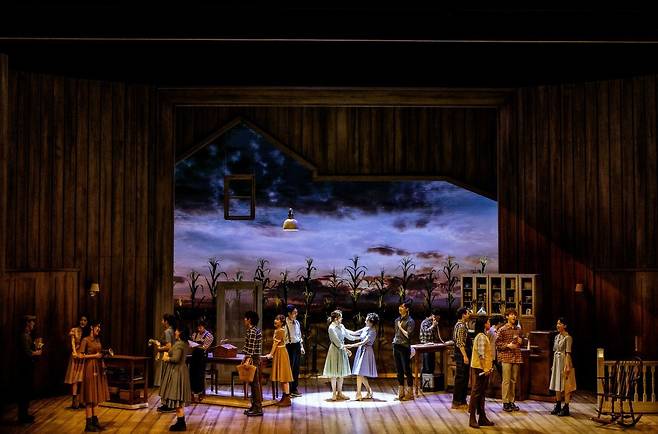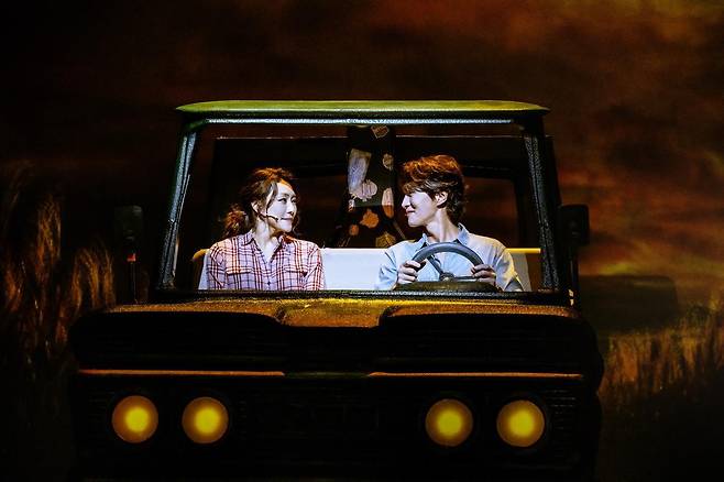 아름다운 수채화처럼 꾸민 무대 역시 두 사람의 사랑을 아련하게 만드는 장치다. 태양이 내리쬐는 옥수수밭과 소박한 통나무집은 목가적 분위기를 물씬 풍긴다. ‘단 한 번의 순간(One Second and a Million Miles)’ 등 서정적인 넘버들도 과하지 않게 귀에 감긴다. 오케스트라에는 그랜드 피아노가 배치돼 풍성한 선율을 담아낸다. 7월 13일까지.