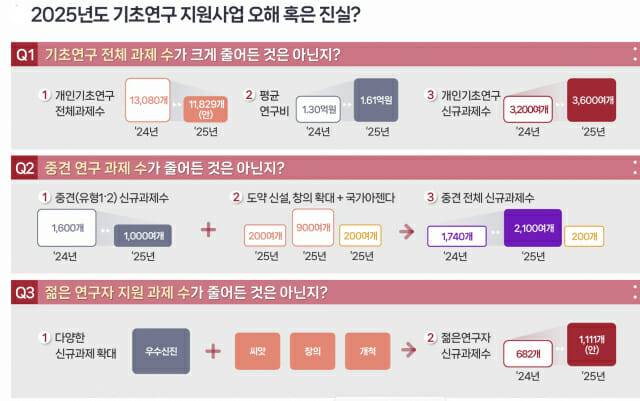 개인기초연구 전체 과제수가 2024년 1만3천80개에서 올해 1만1천829개로 줄어든것은 사실이지만 평균연구비는 2024년 1.3억원에서 올해 1.61억원으로, 개인기초연구 신규 과제수는 2024년 3천200개에서 올해 3천600개로 각각 늘었다고 밝혔다.