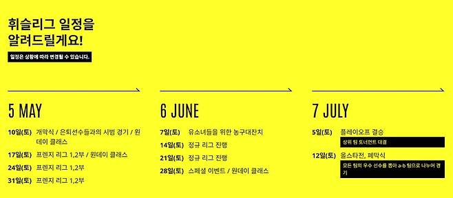 아울러 대회 중간 중간마다 원데이 클래스, 유소녀들을 위한 농구대잔치 등 경기 외적인 이벤트들도 펼쳐질 예정이다. 또, 2025 휘슬리그의 마지막 일정인 7월 12일에는 모든 팀의 우수 선수를 뽑아 A, B 팀으로 나누어 경기를 펼치는 올스타전이 펼쳐진다.