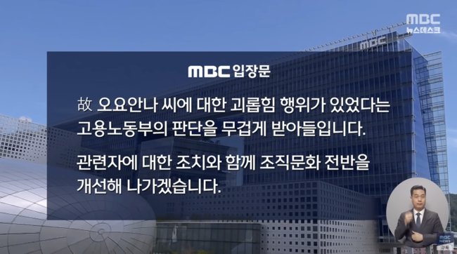 이와 함께 MBC는 공식 입장문을 공개하며 “故 오요안나 씨에 대한 괴롭힘 행위가 있었다는 고용노동부의 판단을 무겁게 받아들인다. 관련자에 대한 조치와 함께 조직문화 전반을 개선해 나가겠다”고 밝혔다.