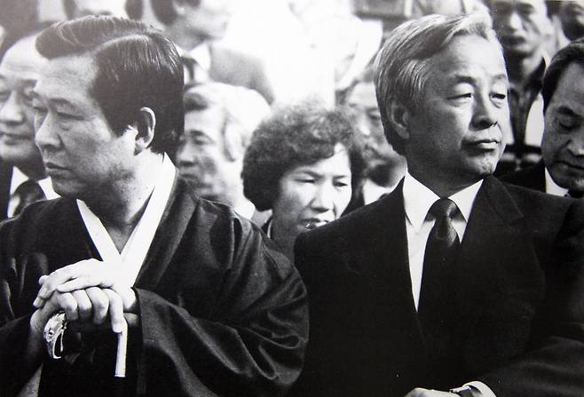 | ▲ 1987년 대선을 앞둔 10월 고려대에서 열린 집회에서 서로 외면한 당시 김대중 통일민주당 상임고문과 김영삼 통일민주당 총재 |