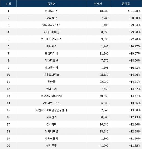 [서울데이터랩]바이오비쥬 101.98% 폭등…금일 증시 상승률 1위로 마감
