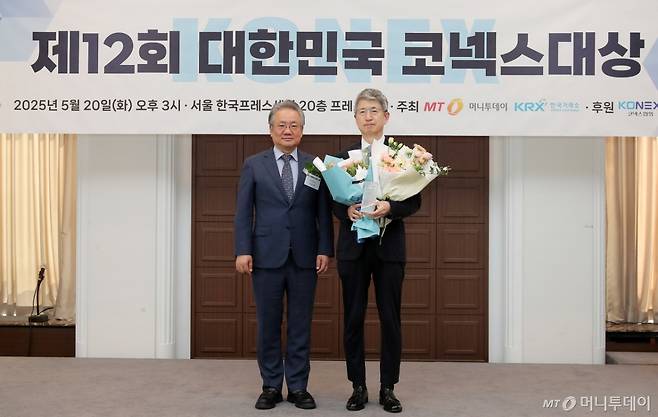 송은강 캡스톤파트너스 대표가 20일 서울 중구 프레스센터에서 열린 머니투데이 주최 '제12회 대한민국 코넥스대상 시상식'에서 베스트 코넥스 하우스 최우수상을 수상한 뒤 강호병 머니투데이 대표와 기념촬영을 하고 있다.