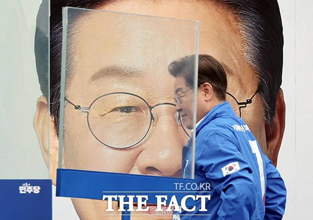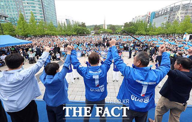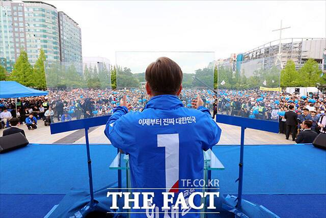 [더팩트ㅣ고양=배정한 기자] 이재명 더불어민주당 대선 후보가 20일 오후 경기도 고양시 일산문화공원에서 장미꽃으로 만든 투표기호를 들어보이며 유세를 펼치고 있다.