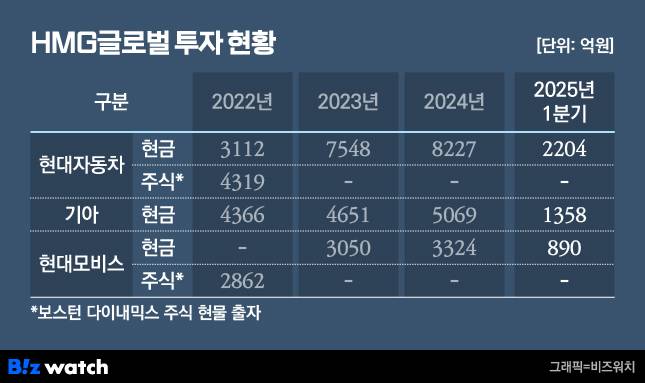 현대차그룹은 이후에도 HMG글로벌 투자를 확대했다. 2023년 1조5268억원(현대차 7548억원· 기아 4651억원·현대모비스 3050억원), 2024년 1조6640억원(현대차 8227억원·기아 5069억원·현대모비스 3324억원) 등이다. 2022년 설립당시 현대차와 현대모비스가 현물출자한 보스턴다이내믹스 주식까지 포함하면 총 투자규모는 5조8410억원에 이를 것으로 집계된다.