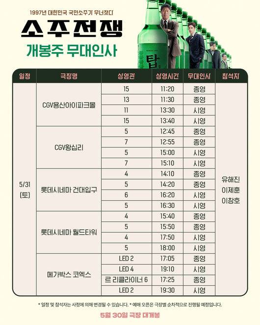 무대인사에서는 ‘유일한 유해진, 무해한 이제훈’ 일명 ‘유일무이’ 콤비인 유해진, 이제훈과 '소주전쟁'에서 깜짝 활약을 펼친 코미디언 이창호가 참석한다. 이들은 CGV 용산아이파크몰을 시작으로 CGV 왕십리, 롯데시네마 건대입구, 메가박스 코엑스, 롯데시네마 월드타워를 방문해 영화 '소주전쟁'을 선택한 관객들에게 진심 어린 감사 인사를 전할 계획이다.