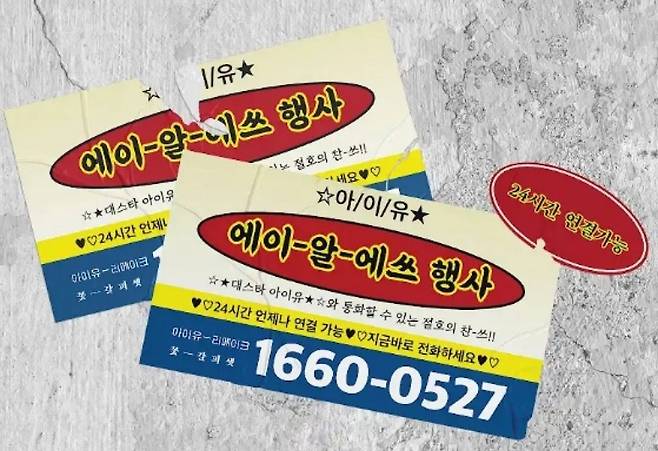 포스터에는 '1660-0527'라고 적힌 전화번호와 '에이-알-에쓰 행사', '대스타 아이유와 통화할 수 있는 절호의 찬스', '24시간 언제나 연결 가능' 등의 문구가 적혀 있다.