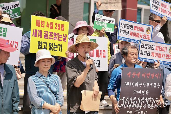 주민들은 "산청군수의 주민불통행정을 규탄한다"라고 했다. 이들은 "산청의 청정한 자연과 사람들, 지리산에 기대어 살고있는 뭇생명들이 무분별한 지하수 취수, 친환경농업을 박살내는 골프장 추진, 군 재정을 빚더미로 내몰고 지리산을 짓밟는 케이블카 추진으로 비명을 지르고 있다"라고 전했다.