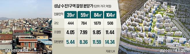 수진1구역 조합원(토지 등 소유자)은 최근 시행사인 LH(한국토지주택공사)로부터 종전자산 감정평가액과 조합원 분양가를 통보받았다. 전용면적 59㎡의 조합원 분양가는 7억9896만원, 84㎡는 9억8516만원이다. 예상을 크게 웃돈 분양가라는 지적이 나온다. 단독주택 등 대지면적 66㎡ 기준 감정가를 5억원대로 평가받아 재개발 후 59㎡ 아파트를 받으려면 약 3억원의 추가 분담금을 내야 하기 때문이다. 84㎡는 약 5억원을 더 내야 한다. 정비업계 관계자는 “최근까지 수진1구역 내 건물은 7억~8억원대에 거래됐다”며 “이 가격에 물건을 산 사람은 추가 분담금을 내면 시세로 사는 것과 별 차이가 없어진다”고 말했다.