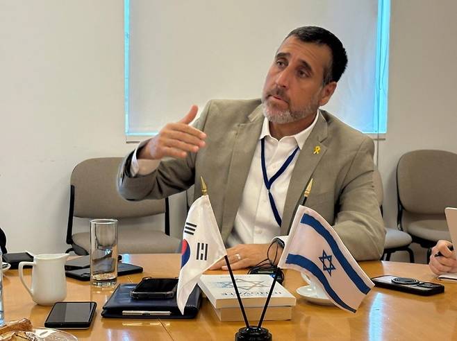 [아비브 에즈라 이스라엘 외무부 아시아-태평양 담당 국장이 예루살렘 외무부 청사에서 한국 기자단과 간담회에서 발언하고 있다. (사진=연합뉴스)]