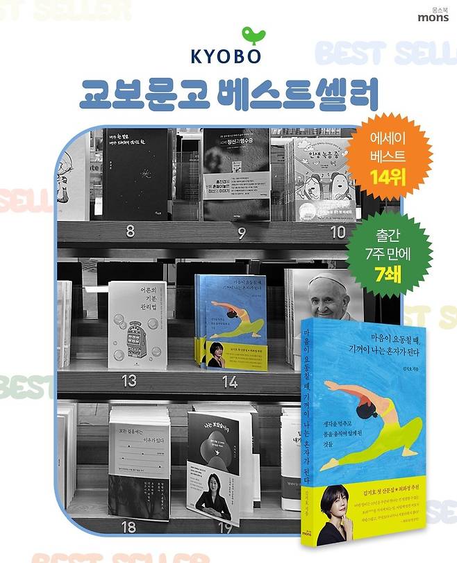 공개된 사진에는 대형 서점의 에세이 부문 베스트셀러 코너가 담겨 있으며, 특히 14위에 김지호의 첫 산문집이 자리하고 있어 눈길을 끈다.