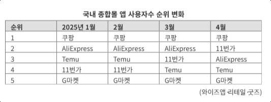20일 와이즈앱·리테일이 한국인 스마트폰 사용자(Android+iOS)를 표본 조사한 결과에 따르면 지난 4월 한국인이 가장 많이 사용한 종합몰 앱은 쿠팡으로 월간 사용자수 3339만명을 기록하며 압도적인 1위를 이어가고 있다. 2위는 11번가가 올랐는데 월간 사용자수는 893만명으로 880만명의 알리와 847만명을 기록한 테무를 제쳤다. 올해 1월만 해도 쿠팡, 알리, 테무 순이었던 이용자수가 3개월새 쿠팡, 11번가, 알리 순으로 재편된 것이다.