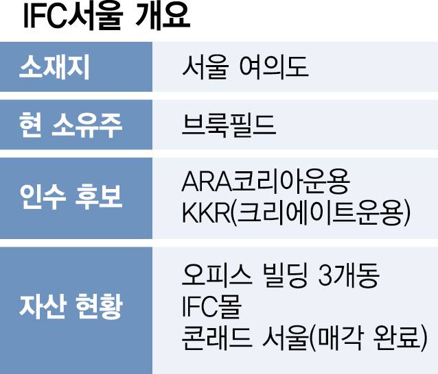 20일 투자은행(IB) 업계에 따르면 IFC서울 소유주인 브룩필드자산운용은 ARA코리아자산운용과 크리에이트자산운용 등 두 곳을 유력한 인수 후보군으로 두고 최근까지 협상을 진행해왔다. IFC서울은 외국인투자촉진법에 따라 전체 지분 10% 이상을 해외 자본이 투자해야 한다. ARA는 일본계 스미토모금융이 최대주주이며 크리에이트는 미국의 글로벌 펀드인 KKR이 출자해 지난해 말 출범했다.