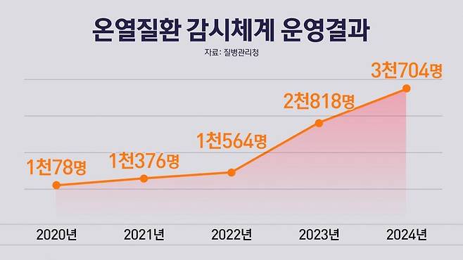 폭염으로 인한 온열질환자의 경우 지난 2020년 1천78명에서 2024년 3천704명으로 3배 넘게 증가했습니다. 모기나 진드기 등을 통한 뎅기열과 같은 열대감염병이 증가할 우려도 적지 않습니다.