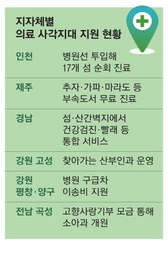 제주도는 부속 도서 주민들을 대상으로 무료 '왕진 서비스'를 제공하고 있다. 제주의료원 의료진이 섬을 직접 찾아 신체검진, 건강상담, 혈당·총콜레스테롤 간이 검사, 수액·약물 처방, 일반 의약품 등을 제공하는 서비스다. 첫 서비스 제공지인 추자도에서 주요 수혜자인 65세 이상 주민과 해녀, 장애인 등으로부터 인기를 끌면서 올해는 가파도와 마라도, 비양도까지 사업 대상 섬을 확대했다.