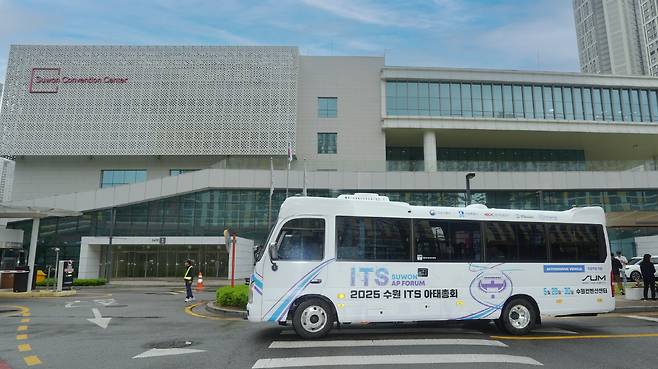 | ▲ '2025 수원 ITS 아태총회'가 개최되는 수원컨벤션센터 앞에서 자율주행 차량이 시험 운행을 준비하고 있다. |