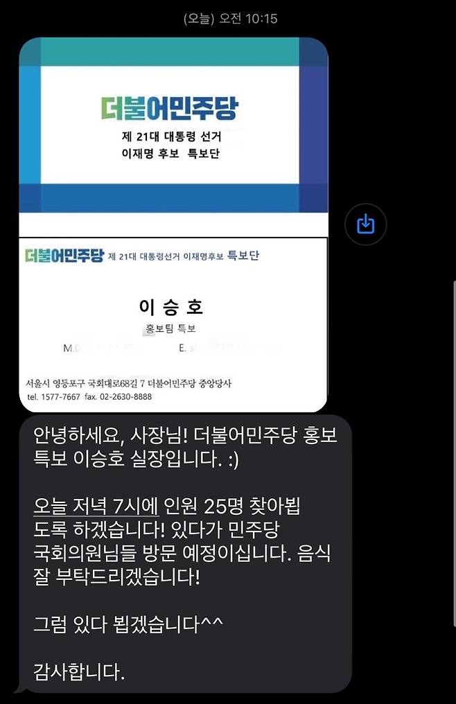 더불어민주당 이재명 후보 홍보 특보 이승호 실장입니다. 이따가 민주당 국회의원님들 방문 예정이십니다.