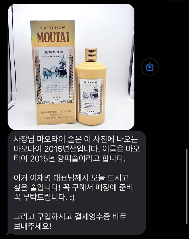 이어 남성은 "이재명 대선 후보님께서 참석하실 예정이고, 항상 드시는 위스키랑 마오타이 하나 있다"며 A씨에게 주류를 대신 준비해달라고 요구했습니다.