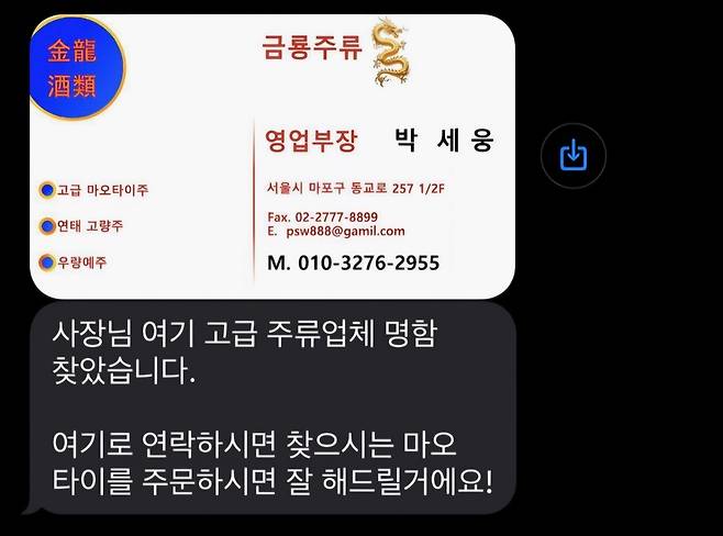 A씨는 남성이 보내온 명함이 미심쩍었고 고가의 술을 대리 구매해달라고 요구한 점에 직접 확인해보기로 했습니다.