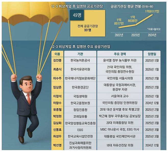 20일 공공기관 경영정보 공개시스템(알리오)에 따르면 작년 12월 3일 윤석열 전 대통령의 비상계엄 후 이날까지 게재된 공공기관 임원 모집 공고는 모두 114건에 이른다. 최근 한 달로 좁혀봐도 신용보증기금, 울산항만공사, 한국농업기술진흥원, 한국국제협력단, 국립해양박물관 등 12개 기관이 공고를 냈다. 또 같은 기간 선임까지 이어진 공공기관장은 49명에 달한다. 이 가운데 윤 전 대통령이 파면된 지난달 4일 이후 임명된 기관장은 9명이다. 전체 331곳에 달하는 공공기관장 가운데 15%가 최근 반년간 국정 혼란기에 신규 선임된 셈이다.