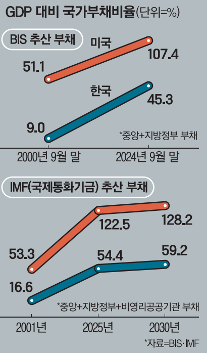 중앙·지방정부 부채와 비영리 공공기관 부채까지 합산한 국제통화기금(IMF)의 부채 통계를 보더라도 2001년 말 16.6%였던 한국의 국가 부채비율은 올해 54.4%를 기록한 후 2030년 59.2%까지 치솟을 것으로 전망됐다. 같은 기준으로 미국의 국가 부채비율은 2001년 53.3%에서 올해 122.5%로 늘어나고 2030년 128.2%를 기록할 것으로 추산됐다.