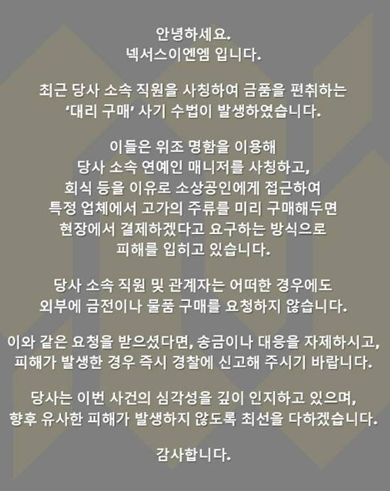 이어 "이들은 위조 명함을 이용해 당사 소속 연예인 매니저를 사칭하고, 회식 등을 이유로 소상공인에게 접근해 특정 업체에서 고가의 주류를 미리 구매해두면 현장에서 결제하겠다고 요구하는 방식으로 피해를 입히고 있다"고 설명했다.