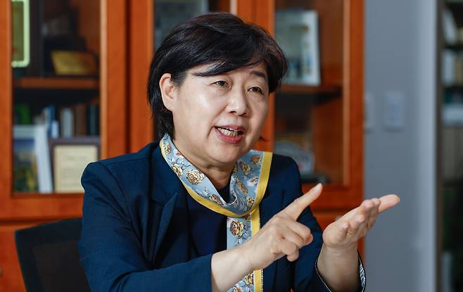 더불어민주당 중앙선거대책위원회 서영교 인구미래위원장이 지난 14일 서울 여의도 국회 의원회관에서 진행한 인터뷰에서 인구 문제 해결을 위한 방향성을 제시하고 있다.최상수 기자