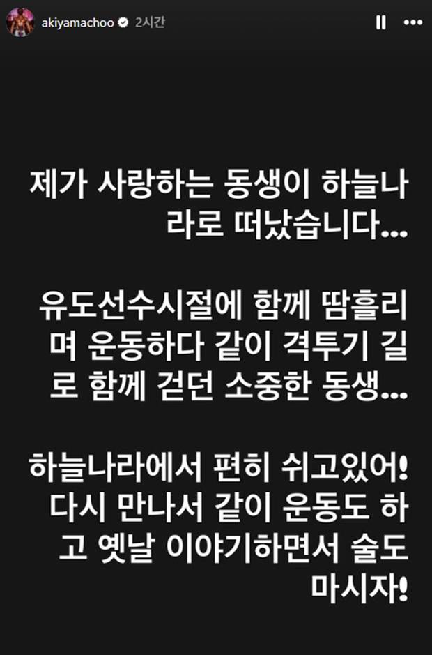 그는 "유도선수 시절에 함께 땀 흘리며 운동하다 같이 격투기 길로 함께 걷던 소중한 동생"이라며 안타까운 마음을 전했다.