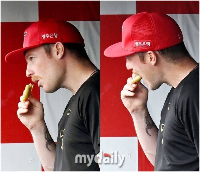 홈팀 kt위즈 선수들이 훈련을 마치고 원정팀 KIA타이거즈 선수단의 훈련이 시작되는 무렵 KIA 덕아웃에서 재미있는 모습이 카메라에 포착됐다. KIA의 외국인 투수 아담 올러가 손에 무언가를 들고 먹으면서 들어오는 장면이 카메라에 잡힌 것.