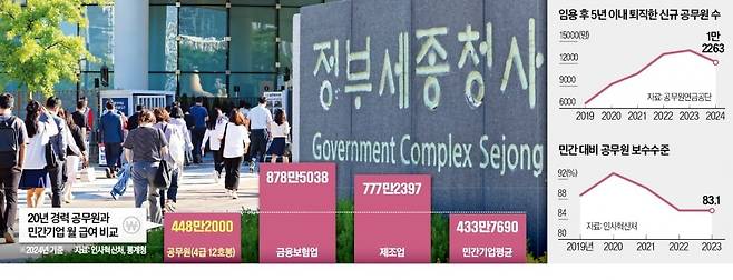 2024년 기준 입직 5년 차 정도인 32세 5급 4호봉 사무관의 월 급여는 305만원으로 30~34세 제조업 종사자 평균 월급(420만원)과 100만원 넘게 차이가 난다. 근무 경력이 20년에 달하는 4급 12호봉 서기관의 월 급여는 448만2000원으로 300명 이상 금융보험업(878만5038원)과 제조업(777만2397원)의 절반 수준이다.