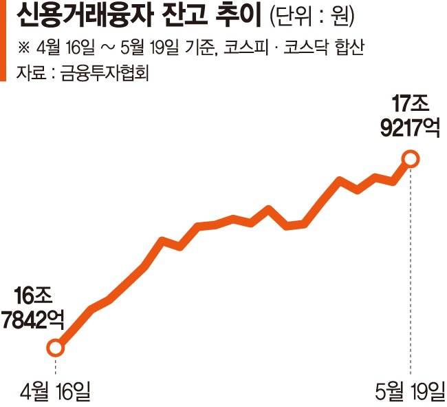 20일 금융투자협회에 따르면 지난 19일 기준 국내 증시의 신용거래융자 잔고는 17조9217억원이다. 유가증권시장에서 10조3145억원, 코스닥 시장에서 7조6072억원이다. 지난 4월 16일 16조7842억원에서 한 달여만에 1조원 이상 늘어난 규모다.
