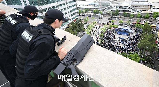 이재명 더불어민주당 대선 후보가 20일 경기 파주시 금릉역 광장에서 유세를 하고 있는 가운데 경찰 특공대가 제밍건을 옆에 두고 경계 근무를 서고 있다.[김호영기자]