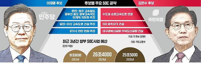 주요 대선 주자가 사회간접자본(SOC) 사업 공약을 앞세워 유권자 표심 잡기에 나섰다. 광역급행철도(GTX), 고속도로 연장 및 지하화, 신공항 건설 등 다양한 공약을 내세우고 있다. 전문가들은 재정이 한정된 상황에서 선심성 공약을 남발하고 있어 실제 성사될지는 두고 봐야 한다고 지적했다.