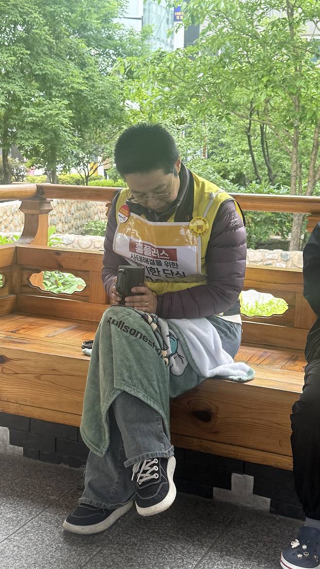 "10만 명의 생존권을 지키기 위한 투쟁을 하는데... 아무리 대화를 하자고 해도, 쟤(홈플러스·MBK파트너스)들이 눈도 깜짝하지 않아요. 우리를 한 번이라도 더 쳐다봐달라, 우리가 있다라는 걸 보여줄 방법이 (단식밖에) 없더라고요. MBK 뿐이 아니라 정치권에도 알려야 되겠다 생각을 했어요."