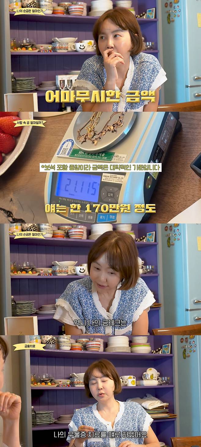 황혜영은 "이 금을 지금 파는 게 더 나은가?"라고 물었고 전문가는 "한 번씩 최고점에서 다시 팔았다가 사는 분도 계신다. 근데 내가 또 갖고 싶으면 또 오른 가격에 사게 된다. 그래서 난 금값은 또 오를 테니 팔지 말라는 주의다. 급한게 아니라면 굳이 지금 팔지 마라"라고 조언했다. 또 "한 번씩 우울할 때 금을 보며 금융 치료를 하라. 내 보석함에 있는 주얼리를 보면 그건 현금과도 같기 때문"이라고 덧붙였고 황혜영은 "오늘부터 우울증 치료를 금으로 하겠다"라며 웃었다.