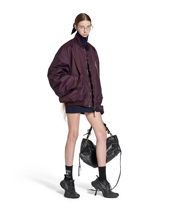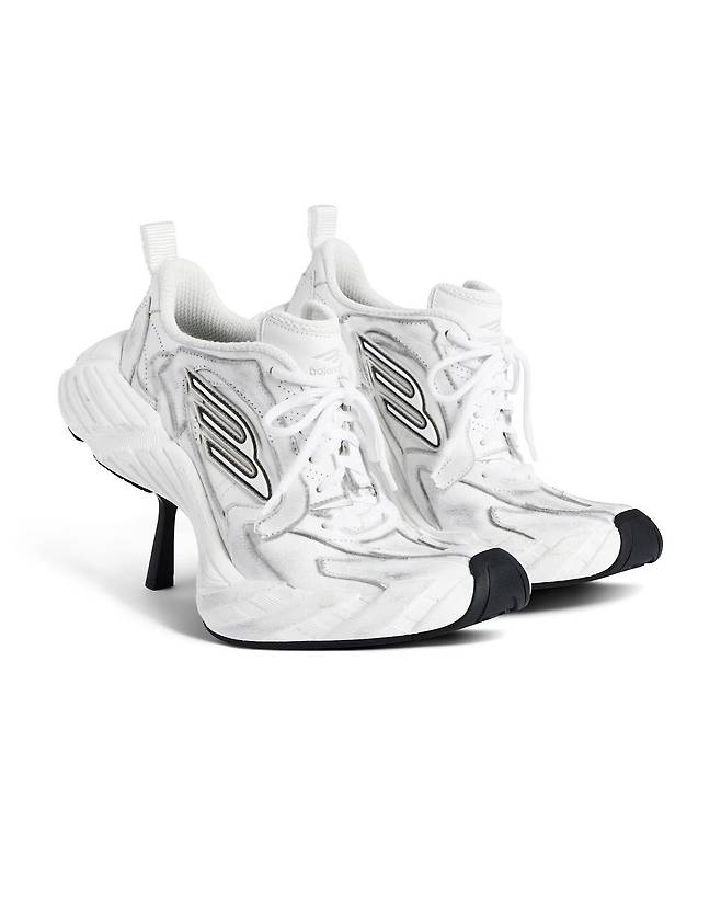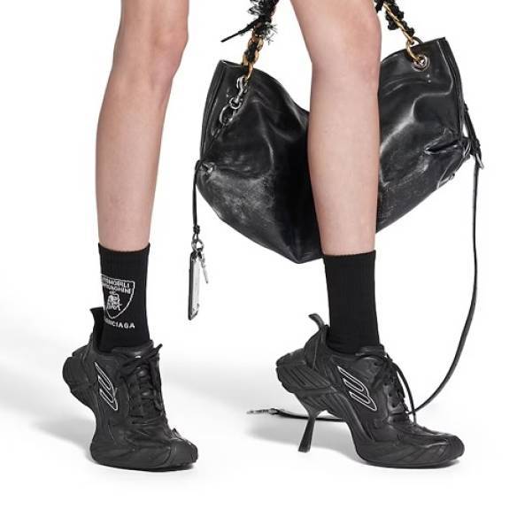 발렌시아가의 시그니처 스니커즈 먼데이 스니커즈 에 뾰족한 뿔이 솟았습니다. 그리고 먼데이 힐 슈즈 라는 이름으로 다시 태어났죠. 둥글고 두툼한 고무 밑창, 옆면에 새겨진 'B' 로고 스티칭 등 먼데이 시리즈 특유의 디테일을 고스란히 담고 있습니다. 기존 디자인은 그대로 유지한 채, 뒤꿈치만 힐로 교체한 형태입니다. 발렌시아가는 이 독특한 신발을 스포티한 트레이닝 셋업에 매치했어요. 힐은 우아한 옷에만 어울린다는 고정관념을 가볍게 날리는 조합입니다.