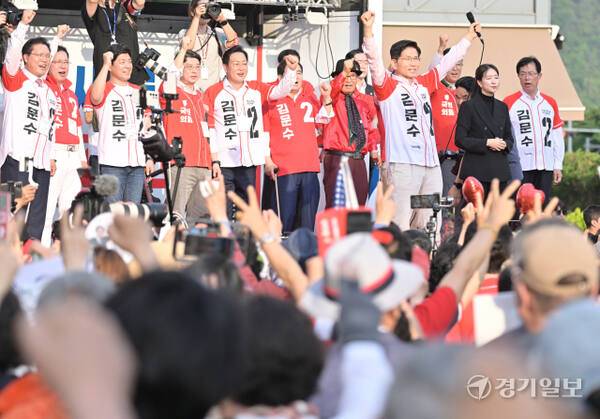 국민의힘 김문수 후보가 20일 오후 하남시 스타필드 앞에 마련된 유세무대에 올라 지지를 호소하고 있다.
