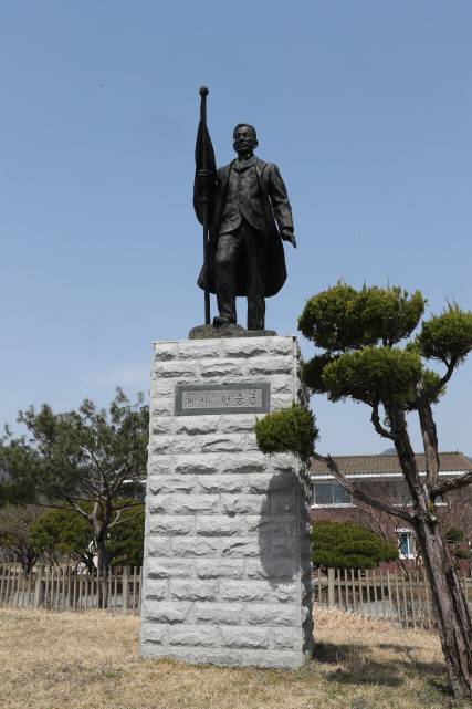 해방된 조국의 민족 정기 수립을 위해 서울 남산에 세워졌던 안중근 의사 동상. 광주 상무대를 거쳐 지금은 장성 상무대에 올곧게 서 있다. 대한민국 제1호 안중근 동상이 거기에 있다.