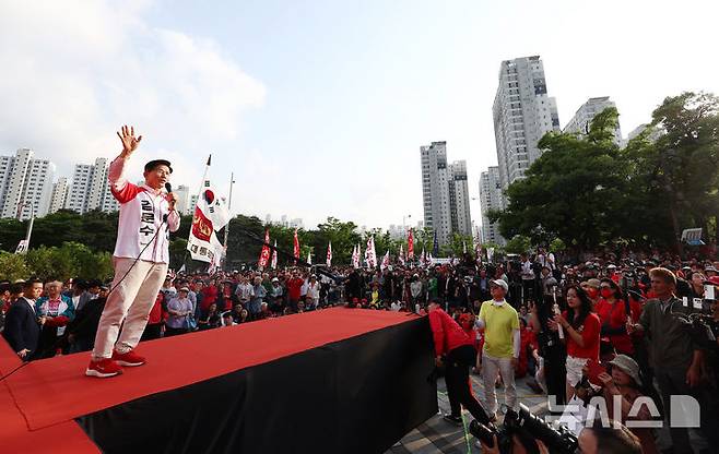 [하남=뉴시스] 고승민 기자 = 김문수 국민의힘 대선 후보가 20일 경기 스타필드 하남에서 유세를 하고 있다. (공동취재) 2025.05.20. photo@newsis.com