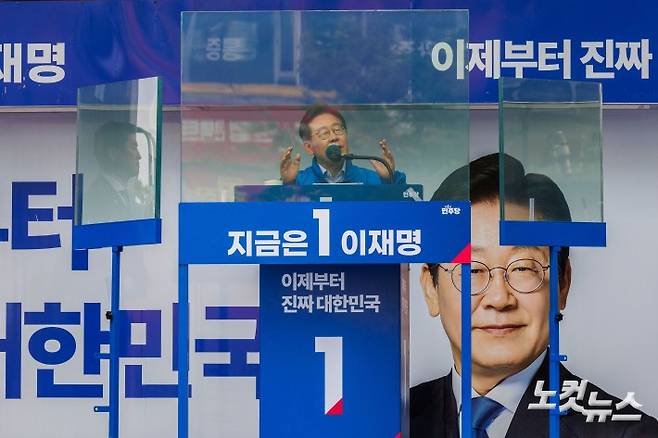 이재명 더불어민주당 대선 후보가 20일 경기 파주시 금릉역 광장에서 열린 파주시 유세에 참석해 지지를 호소하고 있다.