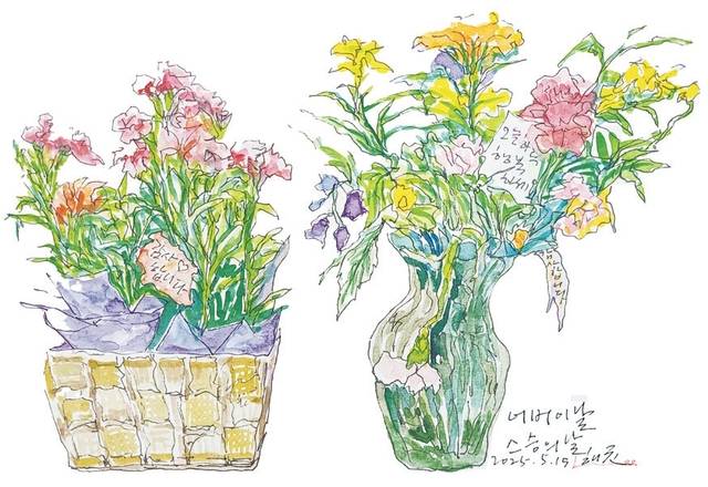 스승의 날이라고, 행궁동 현대미술 교실에서 꽃바구니와 티셔츠 하나를 받았다. 게다가 스승의 날 노래까지 들려주니 이럴 자격이 있을까 불편도 했지만 한편 흐뭇했다. 매교 어반스케치 교실엔 고참 몇 분이 예쁜 다과를 마련해 와 함께 나눠 먹었다. 정성이 고마웠다. 여성회관 어반스케치 교실에도 꽃 한 송이를 에코백에 몰래 매달아 놓아 깜짝 놀랐다. 그리고 맛난 점심식사를 나누며 따뜻한 정이 혈류처럼 흐름을 느꼈다.
