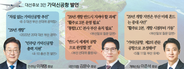 가덕신공항이 ‘부산의 미래 자산’이라는 점에는 6·3 대선후보들 간 이견은 없다. 세계 2위 환적항을 보유한 부산이 가덕신공항까지 품으면 진정한 ‘물류 허브’로 도약할 수 있을 것이란 기대감이 배경이다. 다만 세부 내용으로 들어가면 대선후보들의 구상은 조금씩 다르다. ‘2029년 개항’을 못 박자는 지역 민심에 국민의힘과 개혁신당이 손을 맞잡은 반면, 민주당 이재명 후보를 비롯한 당 지도부는 유보적인 입장을 반복하는 형국이다.
