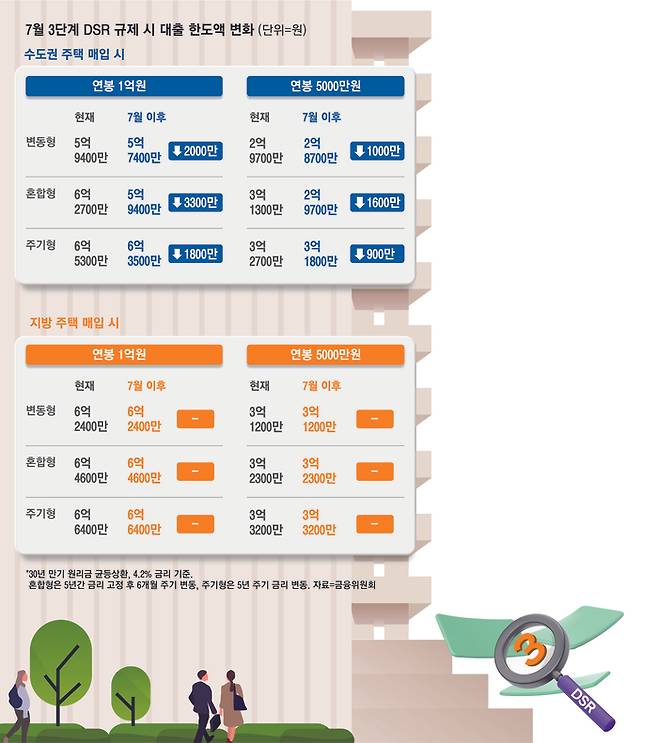 만약 연봉 5000만원인 차주가 수도권에 집을 사려고 4.2% 금리로 30년 만기 원리금 균등 상환 조건으로 변동형 주택담보대출(주담대)을 받는다면 현재 2억9700만원에서 7월 이후엔 2억8700만원으로 대출한도가 1000만원 줄어든다.