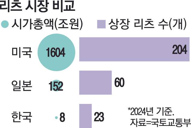 업계는 리츠 인수·합병(M&A) 관련 규정이 완화되지 않으면 리츠 시장이 커지기 어렵다고 본다. 국토부에 따르면 지난해를 기준으로 국내 상장 리츠 수는 23개로 미국(204개)이나 일본(60개)에 비해 한참 뒤처진다. 시가총액도 8조원으로 미국(1604조원)과 일본(152조원)에 비해 극히 작다. 미국·일본에선 M&A가 자유롭다.