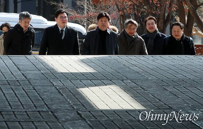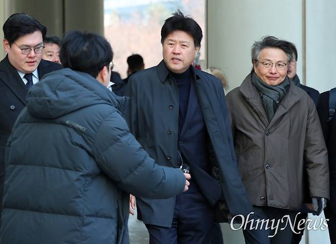| ▲ 2025년 2월 6일, 정치자금법 위반·특정범죄 가중처벌법상 뇌물 혐의로 기소된 김용 전 민주연구원 부원장(가운데)이 서울 서초구 서울고법에서 열린 항소심 선고에 출석하고 있다. |
