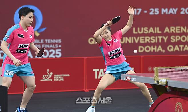임종훈, 신유빈이 20일 카타르 도하 카타르대학교 스포츠 컴플렉스에서 열린 2025 국제탁구연맹(ITTF) 세계선수권대회 혼합복식 16강 폴란드 사무엘 쿨치츠키-주잔나 비엘고스 조와 경기를 펼치고 있다. 2025. 5. 20. 도하(카타르) | 최승섭기자 thunder@sportsseoul.com